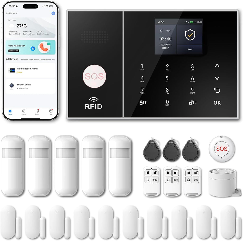 • 【SUPPORT WIFi& 2G/3G/4G】The security alarm system supports 2.4GHz Wi-Fi (does not support 5G) and 2G/3G/4G, Please note: Telephone and SMS services can be achieved by purchasing a SIM card or using the app's call and information services. Even without purchasing these, you can still receive alarm notifications via the app. The alarm system itself does not incur any fees.