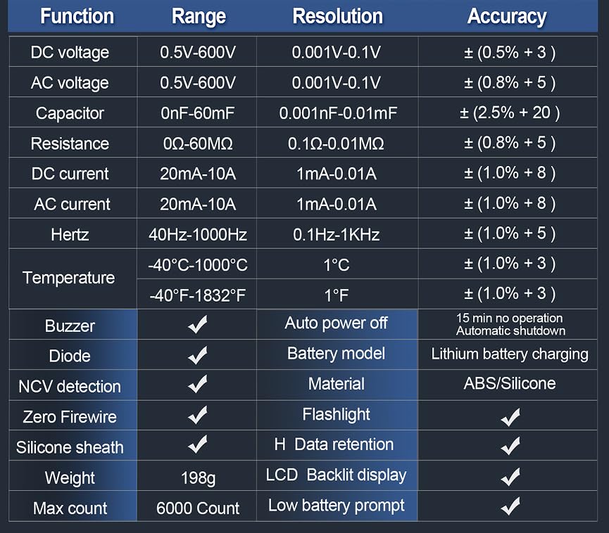 Accessories & Service:Includes 1* digital multimeter,1* test lead,1* temperature probe,1* charging cable,1* manual,and 1* storage bag. Backed by dedicated technical support,this professional volt meter and multimeter tester offers reliability for every electrical project.