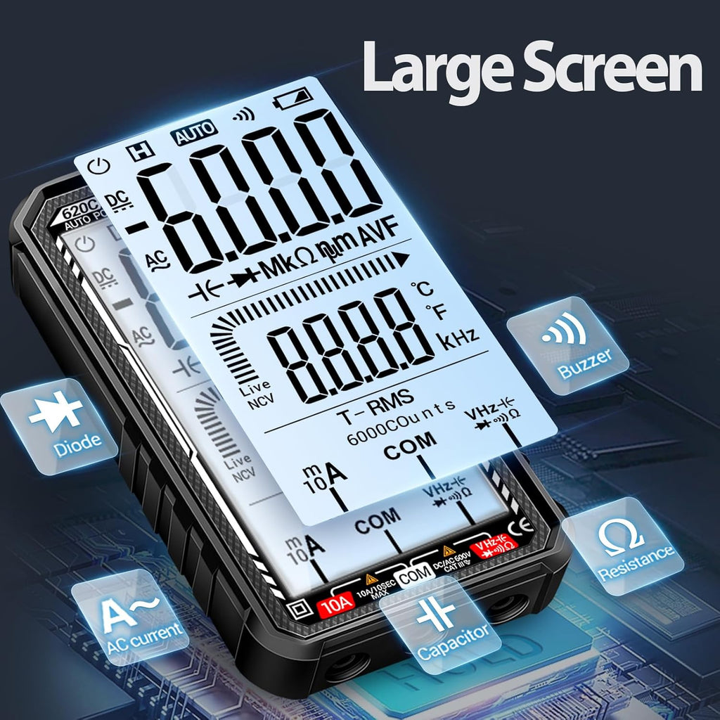 Smart & Manual Mode:The multimeter defaults to Smart Mode,automatically identifying measurements and selecting optimal resolution ranges for effortless testing.This 6000-count voltmeter features a large LCD and built-in flashlight for clear readability in bright or dim environments.It also includes analog-bar display,real-time temperature monitoring,low battery indicators,and data retention to meet diverse needs.