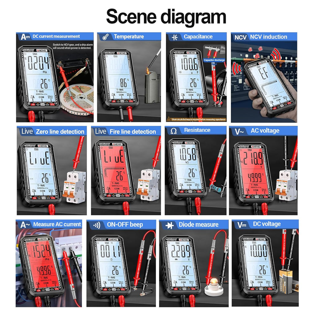 Multi & Function:This digital multimeter works as a comprehensive voltage tester,voltmeter,and circuit analyzer.It accurately measures AC/DC voltage, current,temperature, resistance, capacitance, frequency,continuity,NCV,and diodes,and performs live wire tests—making it a practical option for both industrial diagnostics and household electrical testing needs.