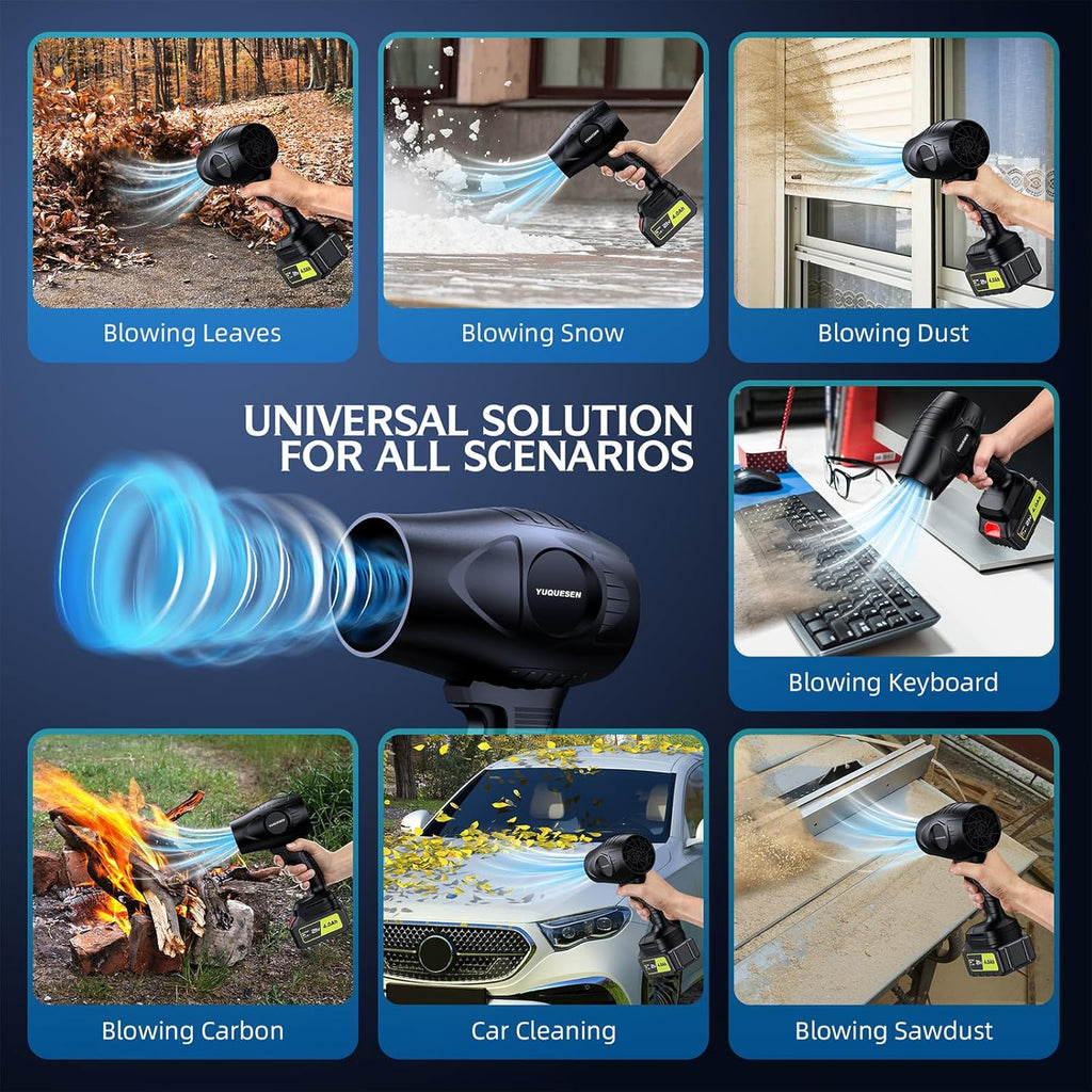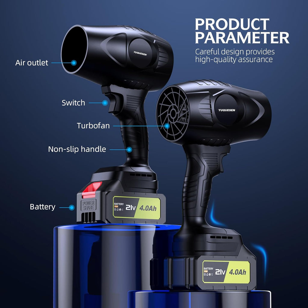 • Leaf blower is designed with a high-speed turbine motor and air blades, with a rotational speed of up to 600000RPM, leaf blower cordless generating a high-speed airflow of more than 50 M/S. The electric leaf blower power is long-lasting and stable, so it will not overheat even when working at full load for a long time.